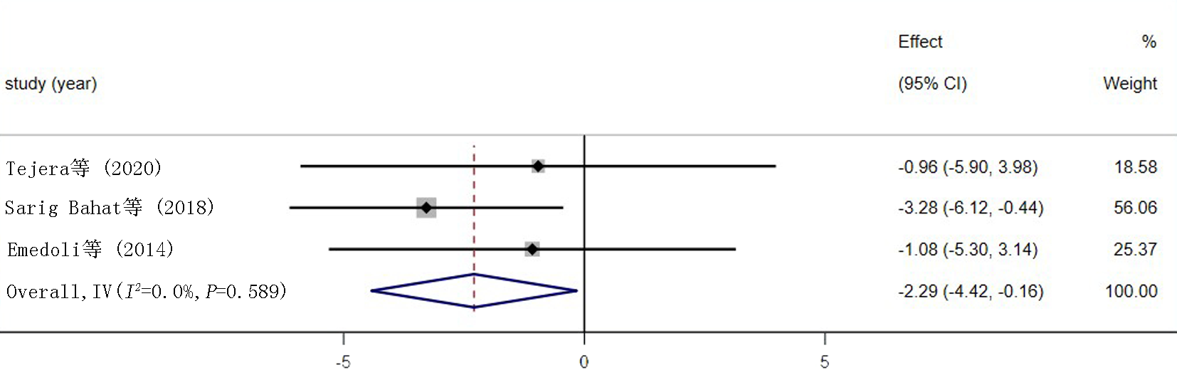| Emedoli等[ | 低风险 | 低风险 | 高风险 | 不清楚 | 低风险 | 低风险 | 不清楚 |