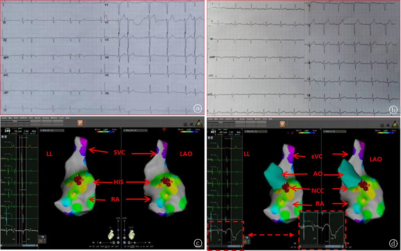 Fig.1 Successful ablation of premature atrial contractions originating near the His bundle region in the NCC a. Preoperative electrocardiogram: P waves are mostly negative/positive biphasic in lead V1 and inferior leads; upright in lead aVR; variable in lead I: low and flat, positive in lead aVL; b. Postoperative electrocardiogram; c. Right atrial mapping, left side is LL (left lateral), right side is LAO (left anterior oblique), yellow points indicate the His bundle, red point shows the earliest activation preceding the surface P wave by 56 ms; d. Fusion image of the aortic sinus and RA:Left side is LL, right side is LAO, yellow points indicate the His bundle, red points indicate the NCC (non-coronary cusp).Note: LL: left lateral