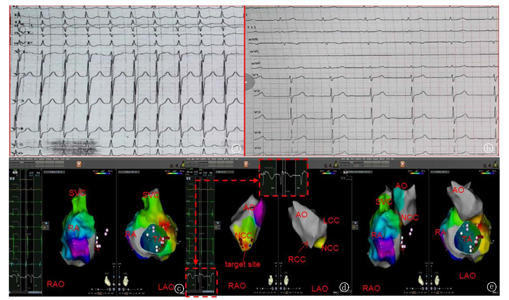 Fig.2 Successful ablation of atrial tachycardias originating near the His bundle region in the NCC a. ECG during atrial tachycardia: P waves appear negative or positive biphasic in lead V1 and inferior leads; upright in lead aVR; negative or positive in lead I, positive in lead aVL; b. ECG after ablation; c. Right atrial (RA) mapping: Left side is RAO (right anterior oblique), right side is LAO (left anterior oblique). Yellow points indicate the His bundle. Mapping near the His bundle septum showed an A wave preceding the surface P wave by 34 ms, but ablation did not terminate the atrial tachycardia; d. Aortic sinus mapping: Left side is RAO, right side is LAO. During atrial tachycardia, mapping showed the earliest local activation at the NCC (non-coronary cusp), preceding the surface P wave by 47 ms, and ablation was successful; e. Fusion image of the RA and aortic sinus: Left side is RAO, right side is LAO. Yellow points indicate the His bundle, red points indicate the earliest activation preceding the surface P wave at the NCC. Note: LCC: Left coronary cusp; RCC: Right coronary cusp; TA: Tricuspid annulus; AO: Aorta