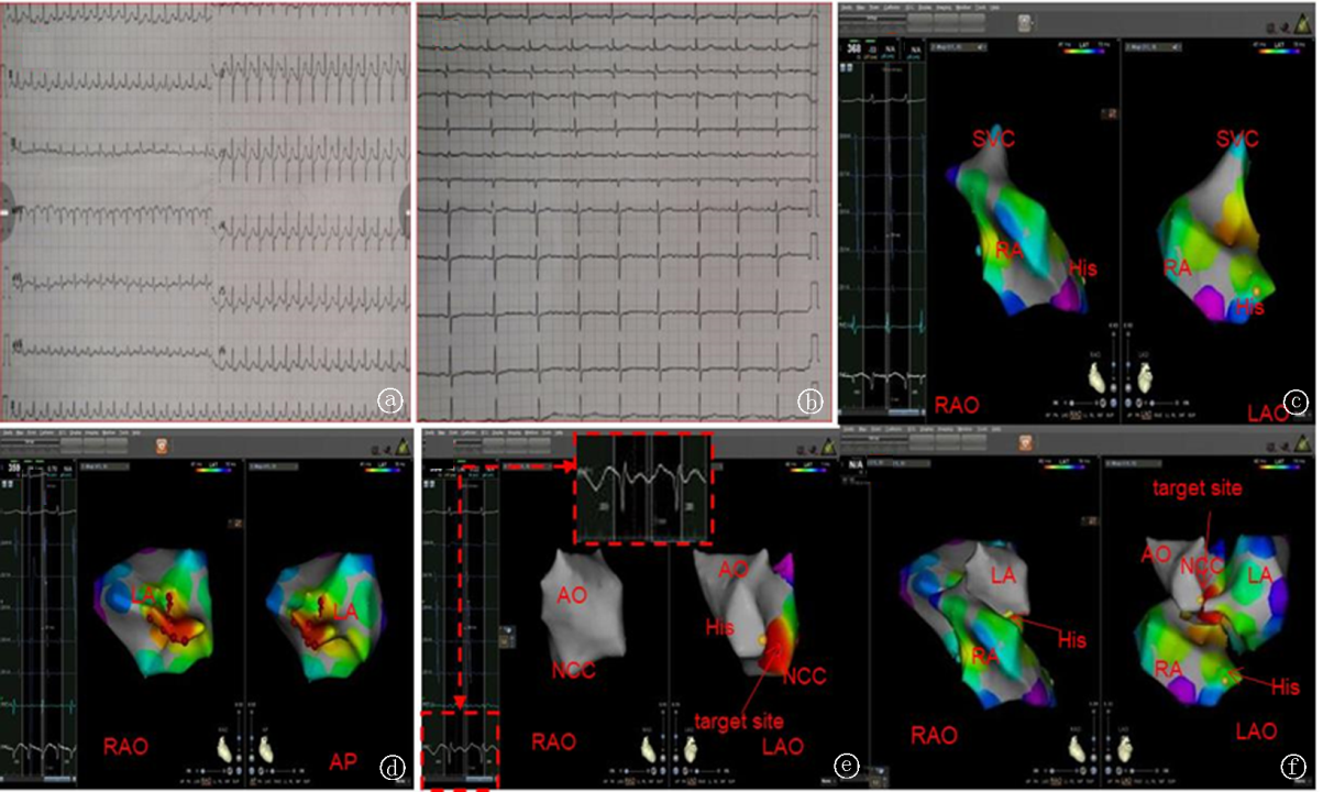 Fig.3 Successful ablation of atrial tachycardias originating near the His bundle region in the NCCA, but ineffective in the right atrium near the His bundle and the left atrium through the interatrial septum a. ECG during arrhythmia: P wave upright in V2-V3, AVL, RP > PR; b. EC after ablation; c. Modeling map of the right atrium: RAO on the left, LAO on the right, yellow is the His bundle, A wave leads the P wave by 51 ms on the interspace surface, ablation ineffective; d. Modeling map of the left atrium: RAO on the left, AP on the; puncture the interatrial septum, local potentials (red) were recorded in the anterior wall of the left atrium in the anterior interspace, which led the P wave by 26 ms, ablation ineffective; e. Modeling map of the aortic sinus: puncture the femoral artery, the aortic sinus was during the arrhythmia, indicating that the local excitation was the earliest to lead the surface P wave by 21 ms, ablation was successful; on the left is RA, on the right is LAO, the yellow dot is the His bundle, the red dot is the earliest to lead the surface P wave by 21Mms, discharge, rial tachycardia terminated; f. Modeling map of the aortic sinus, RA, and LA fusion: RAO on the left, LAO on the, yellow dot is the His bundle, red dot is the earliest to lead the surface P wave in NCC. Note: AP: Anterior-posterior position; RA: Right atrium; LA: Left atrium; AO: aorta