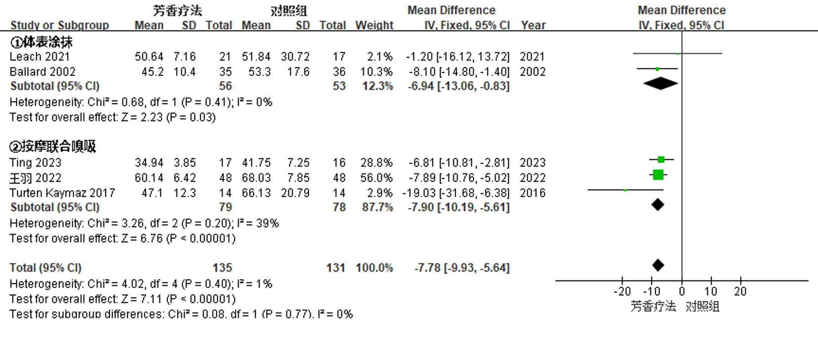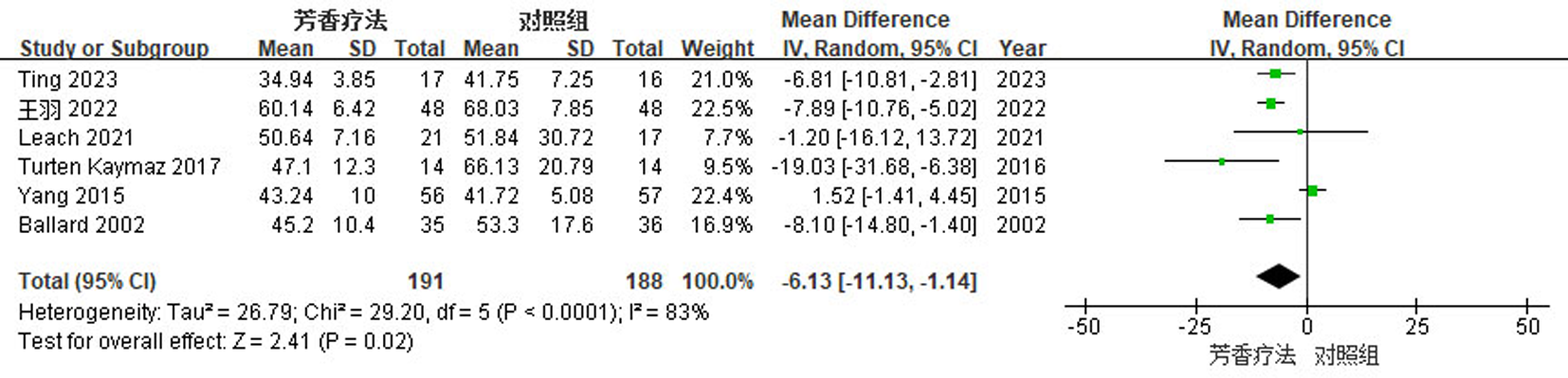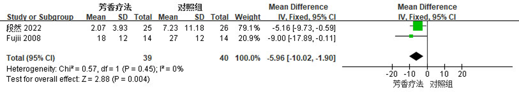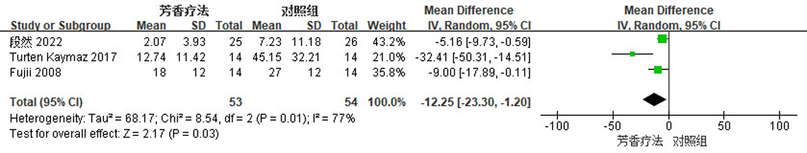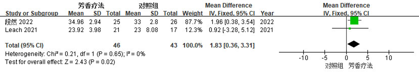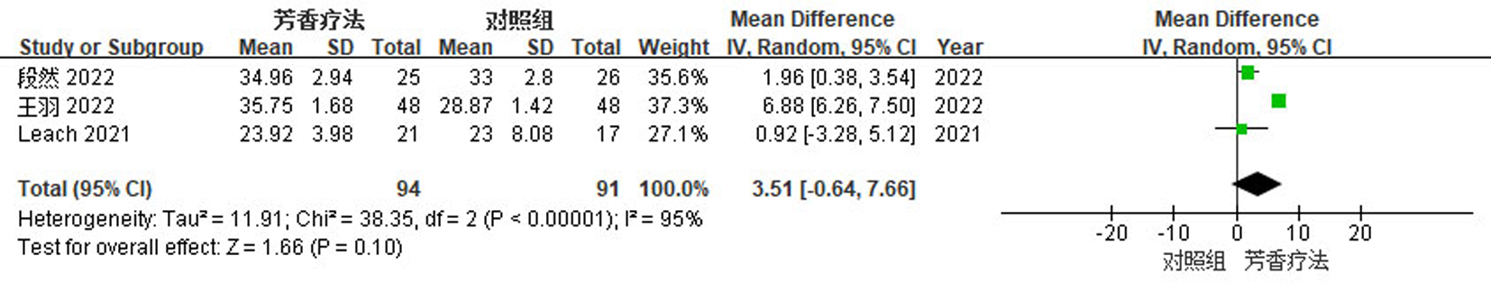 Objective To systematically evaluate the effect of aromatherapy on behavioral and psychological symptoms of dementia and quality of life in the elderly with dementia. Methods Randomized controlled trials investigating aromatherapy interventions for the elderly with dementia were retrieved by searching Chinese and international literature databases. The Cochrane Risk of Bias tool was used to assess the methodological quality of the included studies. Primary outcome measures were explored by a meta-analysis using RevMan 5.4 software. Results A total of 14 studies involving 730 elderly patients with dementia were included. The meta-analysis showed significant differences in the following outcomes: the Neuropsychiatric Inventory score (MD=-5.96, 95%CI=-10.02, -1.90, P=0.004), the Cohen-Mansfield Agitation Inventory score (MD=-6.13, 95%CI=-11.13, -1.14, P=0.02), and the Quality of Life in Alzheimer's Disease score (MD=1.83, 95%CI=0.36, 3.31, P=0.02)(all P<0.05). Conclusion Current evidence indicates that aromatherapy can effectively improve behavioral and psychological symptoms of dementia and quality of life in elderly patients with dementia, with a high safety profile.