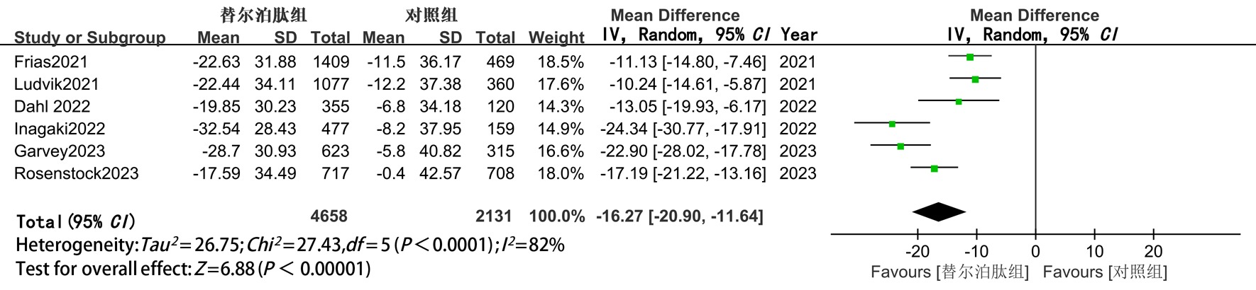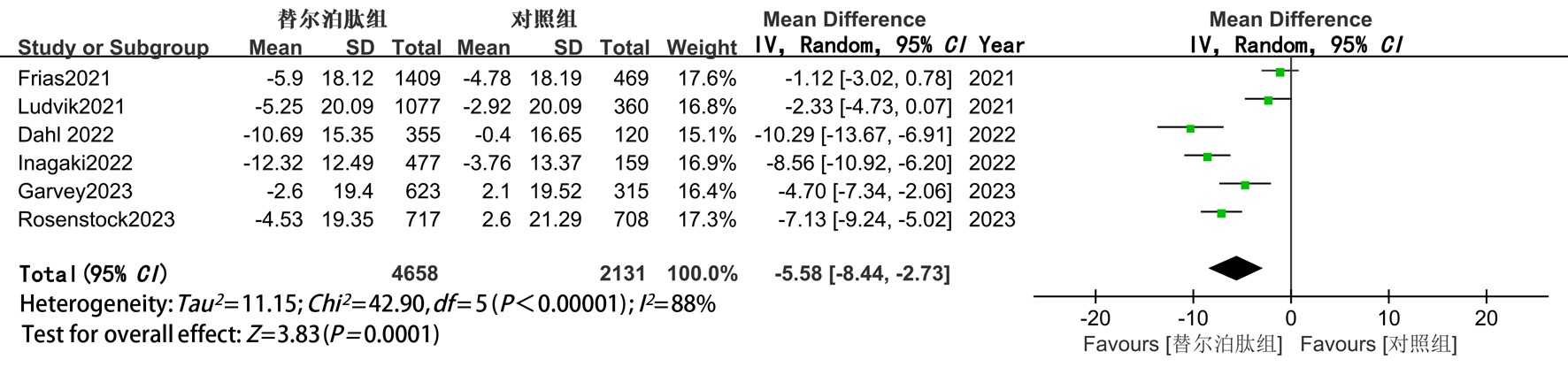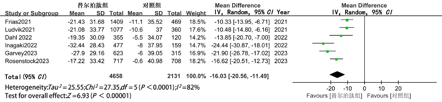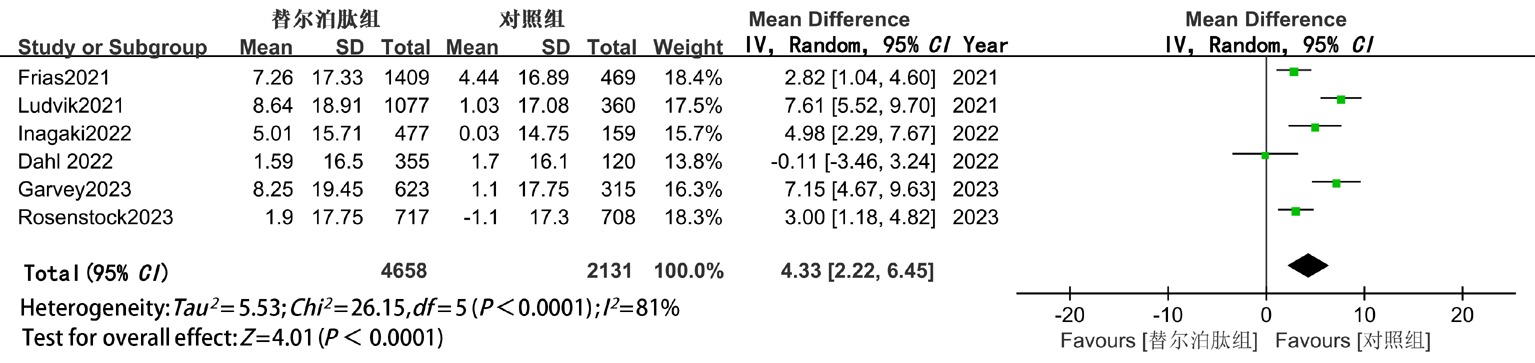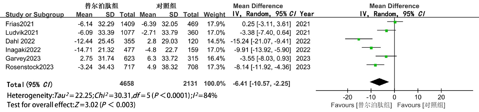 | MD(95%CI) | P值 | 替尔泊肽vs GLP-1RA或胰岛素 | 替尔泊肽vs安慰剂 | ||||